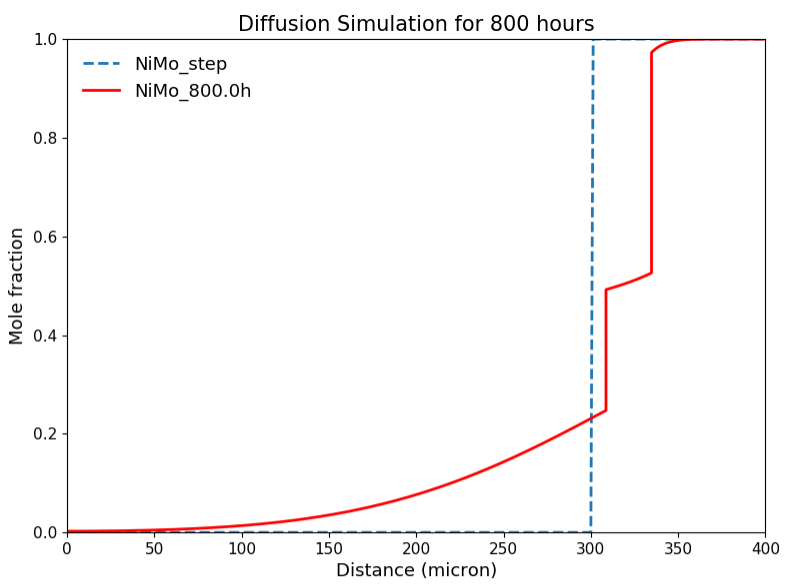 これを使用すると相互拡散係数と濃度分布を比較的簡単に計算できる。下はPydiffusionの公式ガイドに記載されているNi−Mo系の計算例で縦軸はNi濃度を示す。