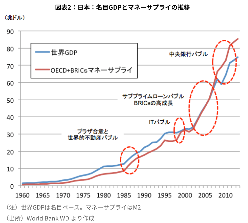 次にこのGDPと通貨供給量(マネーサプライ)の関係を見てみる。下の図は独立行政法人経済産業研究所のサイトからのもので、その下にリンクを示す。世界のGDPと通貨供給量の経時変化を示している。