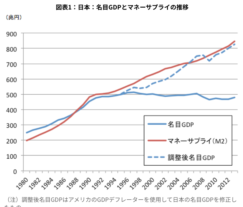 これは日本において特に顕著となっている。下の図も上の経済産業研究所のサイトからのもので、日本だけを取り出したものである。調整後名目GDPはある仮定をおいて調整した数字なので、名目GPDとマネーサプライ(通貨供給量)の関係を見て頂きたい。