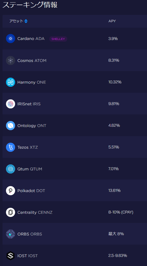 実際にステーキングしたのは、CardanoとPolkadot。特にPolkadotはAPYが13.6%と非常に高い数字となっている。手数料については、Cardanoの場合APY3.9%に対して手数料2.5%、PolkadotではAPY13.6%で手数料はバリデータによる、と記載されているので具体額は不明。結構手数料は取られてしまう。Moonstake社もバリデータをやっていて、ウォレット自体は無料で収入はバリデータとして得ている。
