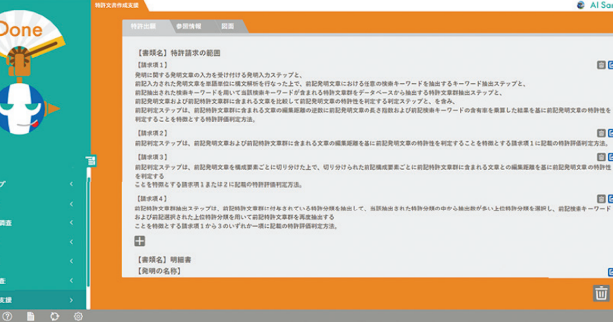 このAI Samuraiの紹介ウェビナーを聴かせて頂いたところ、現段階はまだ半自動生成のようなイメージで、1次原稿をこのサービスで作成してその後弁理士が手直しして明細書を完成させる前提ということだった。また、図面を作成することはできないので、図面は別途作成しなければいけない。とは言え、この技術領域は進歩が速いので、いずれ全自動作成ができるようになるのかもしれない。