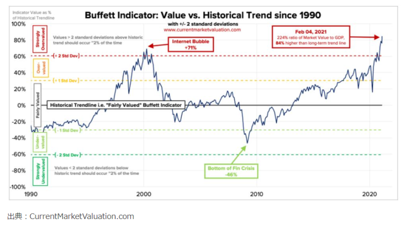 ビットコインや金、特に米国の株価などはここ10年近く上昇を続けている。米国経済は必ずしも不調ではないものの、実体経済の伸びと比較してこれら金融資産の伸びが大きいことが指摘されている。下のサイトは米国におけるバフェット指数(株価のGDPに対する比率)が2021年に過去30年で最高レベルまで上昇していることを示している。