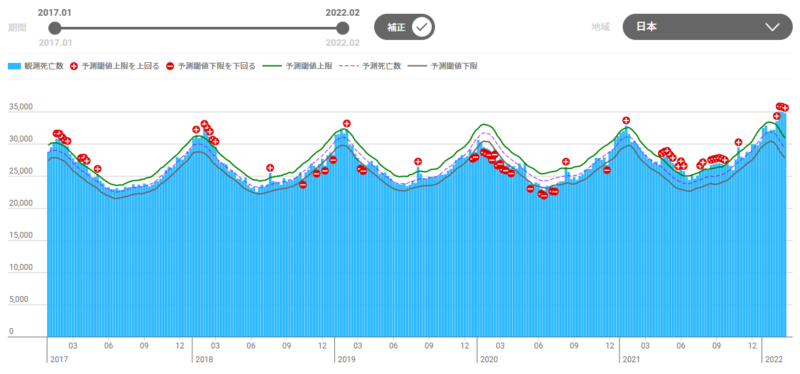 更に、死亡者数だけではよくわからない点もあるので、超過死亡者数も調べてみた。超過死亡者数とは、本来統計的に推定される死亡者数と実際の死亡者数の差異を意味する。これについても、国立感染症研究所が日本国内の超過死亡者数を公開しているので、これを確認してみた。このサイトではまだ2月分までしか公開されていない。