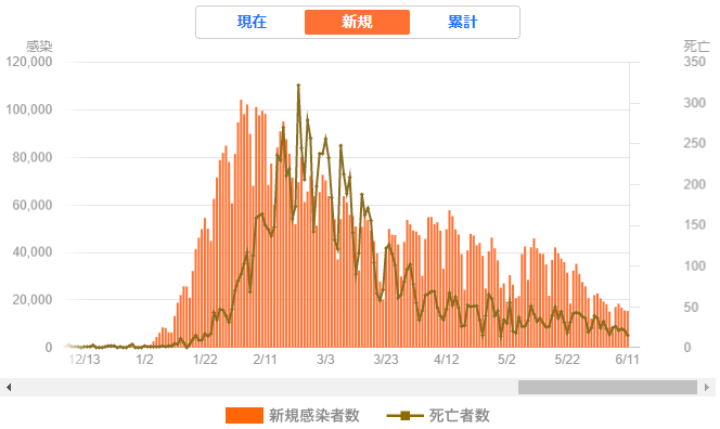 この図では、予想される死亡者数が点線で、予想の上限が緑色の線で示され、棒グラフは実際の死者を意味している。+記号のついたところは予想上限よりも高いところとなる。これを見ても2021年から+記号が増え始めて2022年に入ってからは大きく上に振れていることがわかる。また下の図は新型コロナによる死亡者数を示したもので、2月に入ってからの死亡者数は1日当たり50~100人となっている。上の図は週ごとに集計したデータなので、週当たり350~700人が新型コロナによる死者数となる。上の図で推定死者数と実際の死者数は2月では約5000人に達しているので、新型コロナ以外の要因が大きい、となる。