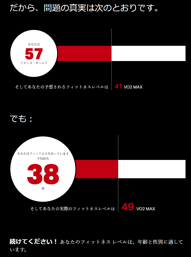 早速このサイトを使用して、実年齢を推定してみた。下がその結果となる。実年齢に対して‐19歳となった。実年齢の平均的なVO2maxよりも高いVO2maxを持つためだろう。現在月間120km程度走っているので、その効果であろうと思われる。