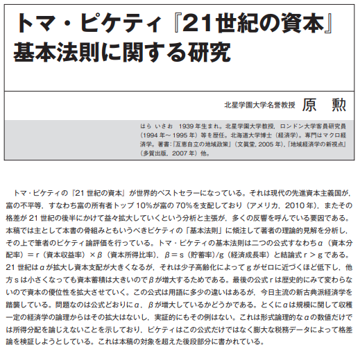 この書籍において、経済が産まれて以降の実績として資本収益率は5%弱、経済成長率は0.5〜3%であることが示された。富めるものがより富んでいく傾向にあることは何となく理解できるため、肌感覚として上記の関係があることは理解できるものの、では何故経済成長率よりも資本収益率の方が高いかということに関してはこの書籍内でも示されていない。ピケティの本は700ページ以上と膨大であるが、下の資料にそのエッセンスが記載されている。