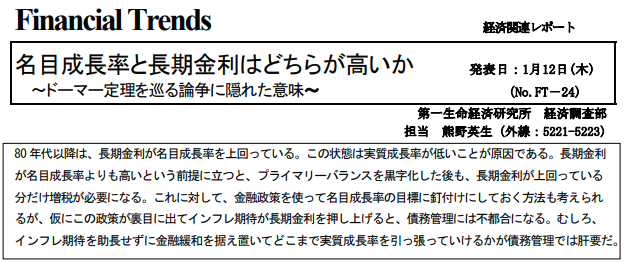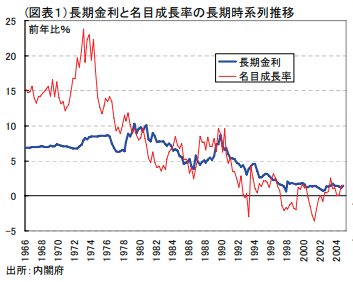 下の資料は第一生命経済研究所の方のレポートで、日本国内の経済成長率と金利の関係を調査したものである。ピケティの言うrは、金利だけでなく株式や債権等からのリターンも含んだものなので金利よりも大きい数字になる筈であるが、ここではそこは無視する。