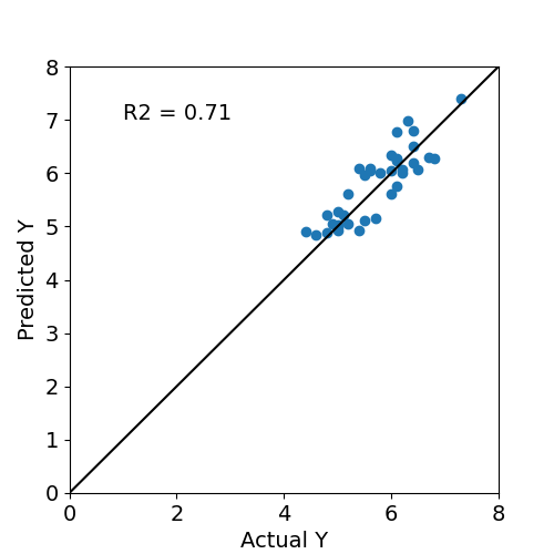 決定係数は0.71と単純な線形回帰よりも0.01だけ良くなったものの、殆ど変化しなかった。今回の系に対しては影響の大きな因子が2つ(Petal LengthとPetal Width)のみで他の影響が小さいため、どのように選択しても影響の大きな因子が支配的になるためと思われる。