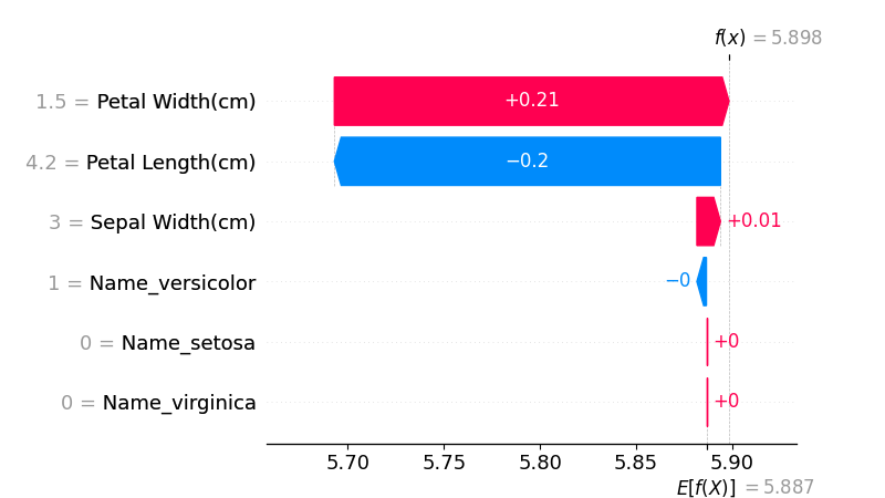 これに対して、説明変数の重要度をSHAPで計算させてみた結果が下となる。Sepal Lengthに影響するのは主にPetal WidthとPetal Lengthで、Sepal Widthはあまり影響しないというちょっと意外な結果となる。