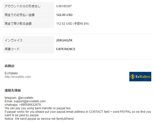 どうしようもないので、別の手段を検討することにした。現金引出しとして上記メニューの上から2番目の「現地の最寄りの両替店利用」というのを試みてみた。このメニューは認証アカウントであることは要求されなかったので実行することはできた。最寄りの両替店というのがどこなのかわからなかったが、日本であればExWallets.comというサイトを指定され、無事手続きは完了した。下がPerfect MoneyからExWalletsへ引出し請求した画面で、手数料8%は取られたもののこれでPaypal経由で現金化できることになった。