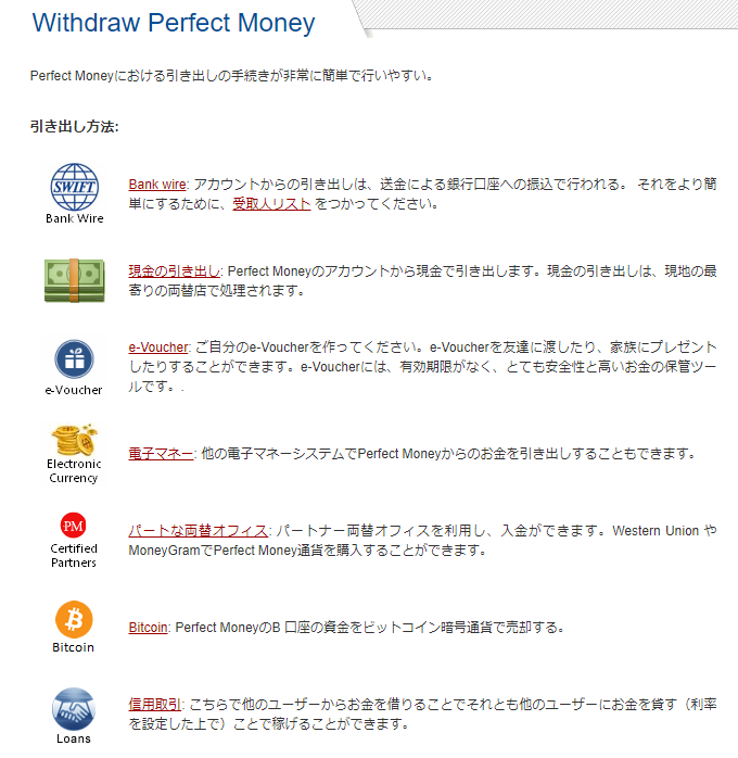 Perfect Moneyは日本語のサイトも持っていて、会員登録等は問題なく可能であった。ドルへの変換も問題なく可能で、あとはドルをどうやって現金化するかというところまできた。Perfect Moneyの現金引出しは幾つかの選択肢があり、下のような画面が出てくる。