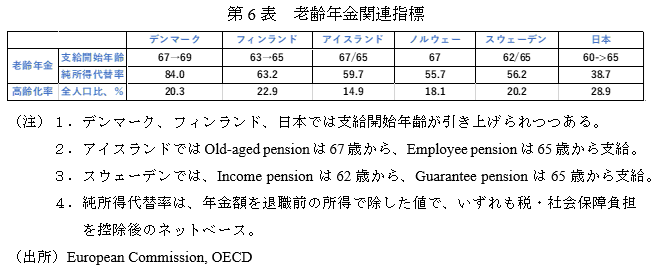このサイトから2つのデータを引用する。1つは教育負担を示したもので、公教育授業料の負担を示したものである。北欧諸国の多くは義務教育後の高等教育も無料となっている。もう1つはその下の表で老齢年金の支給開始年齢と現役時代の所得に対する年金額の比率を示している。北欧諸国の支給額は日本に比べてかなり多いことはわかるが、支給開始年齢という観点からは大きな相違はない。しかしデンマークのように現役時代の84%を支給して貰えるとなれば、確かに老後の心配をする必要はほぼなくなる。