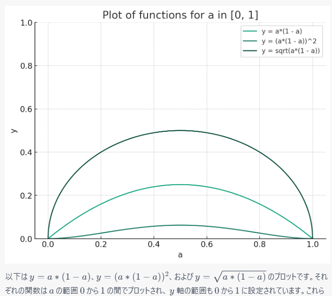 今回はcsvファイルの処理ではなく、図を作らせてみることにした。まず通常のGPT4で「xの範囲が0~1, y=a*b, a+b=1を満たすような図を作って下さい。」と入力すると、「私はAIであり、テキストベースのモデルであるため、直接的な図を作成する能力はありません。しかし、あなたがどのように図を作成するかについては説明することができます。」と返答してどのような図になるかを説明し始める。しかし、Code Interpreterで同じことを入力すると下のように勝手に図を描写してくれる。こちらの指示のxの範囲が0~1というのは本当はaの範囲が0~1の間違いだったのだが、間違いもちゃんと修正してくれているところが素晴らしい。
