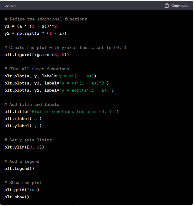 x軸、y軸の指定や凡例の指示等全く必要なく、適当に指示するだけで勝手にそれなりの図を作ってくれるのは有能だ。更に、「show work」をクリックすると下のようにpythonのソースコードも出してくれる。