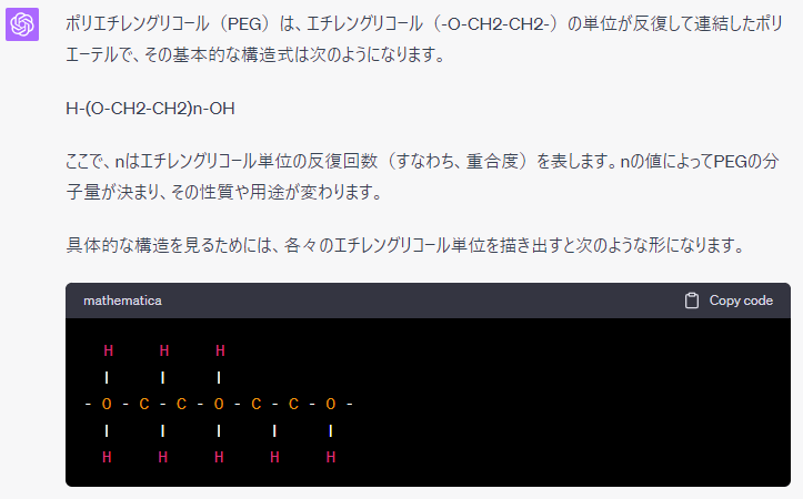 下が自信たっぷりの嘘の実例。「ポリエチレングリコールの構造式を教えてください。」と入力したところ、下のような構造式を示してきた。これはO(酸素)に2個のH(水素)が結合していたりCとCの間にHが結合していたりして、明らかな大嘘である。このくらい大嘘だとすぐに気が付くが、微妙な嘘を返されるとすぐには気が付かないかもしれない。