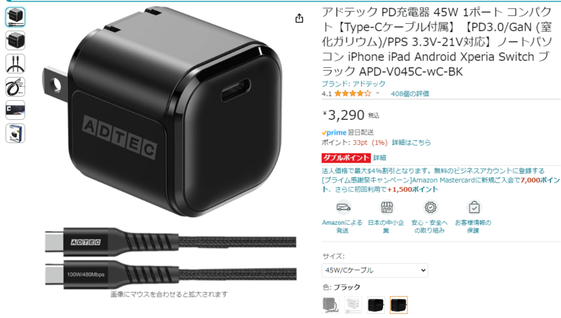 出張や旅行などに出かけるときに、PCを持ち歩きたい。PCも持ち歩きやすいように1kg以下のものを購入した。ところがPCに付属してくる充電器がかさばる上に重く、これだけで500g位ありそうだ。これでは折角軽量PCを購入してもそのメリットを十分享受できない。充電端子はUSB-Cであり、この形状の端子を持ち、軽量な充電器はないものかと探してみた。
