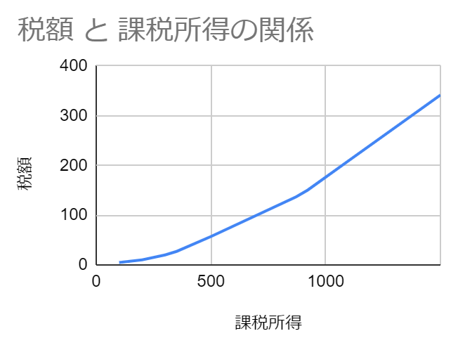 所得税は累進課税であることは恐らくほとんどの人が認識していると思うが、所得税の税率が変更される境界の所得があり、この前後で有利になる、不利になる、ような議論がされることが多い。特に差が大きいのは所得がおおむね900万以下では税率23%で、900万以上では33%となることからこの境界で云々というような議論がされる。しかし所得税には控除額があり、実際にはそのような境界が産まれないような工夫がされている。国税庁が公表している所得税率表を基に課税所得と所得税の関係をプロットした図が下である。