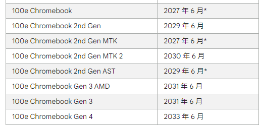 最近になって「そういえばこの品種の自動更新期限っていつなんだろうか?」という疑問が生じてGoogleのサイトで自動更新ポリシーを調べてみた。すると、下のようにChromebook 100eというのは沢山あり、世代が幾つかに分かれている。Amazonのものがどれに相当するかよくわからないが、Chromebook 100eであるとすると、その更新期限は2027年6月であと3年しかないということになる。