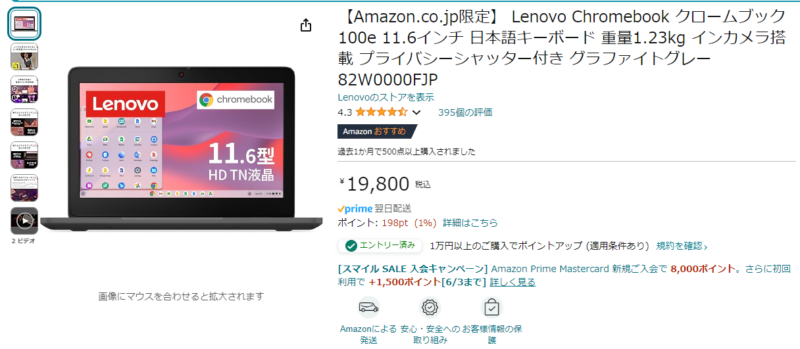 最近は自動更新期限は10年程度とられているため、上記の事態は生じにくくなっているようだ。そのような状況下で、今年の2月に新しいChromebookをAmazonで購入した。下の画面は最近のものだが、ここに示されているように格安で、画面も比較的大きい。Amazon限定品種との記載もされている。