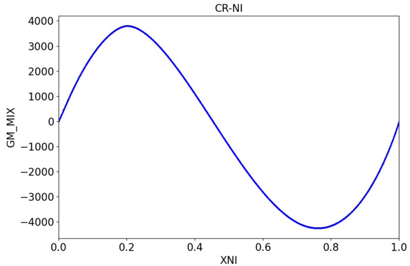 それでも一応過剰エネルギーを出力させることはできて、例えばCr-Ni系で下のような過剰エネルギー分布が得られた。横軸はNiの組成、縦軸は混合の過剰エネルギーを示す。これもうまくデータベースを選ばないとうまく値が出てこないので、色々とノウハウが必要そうだ。